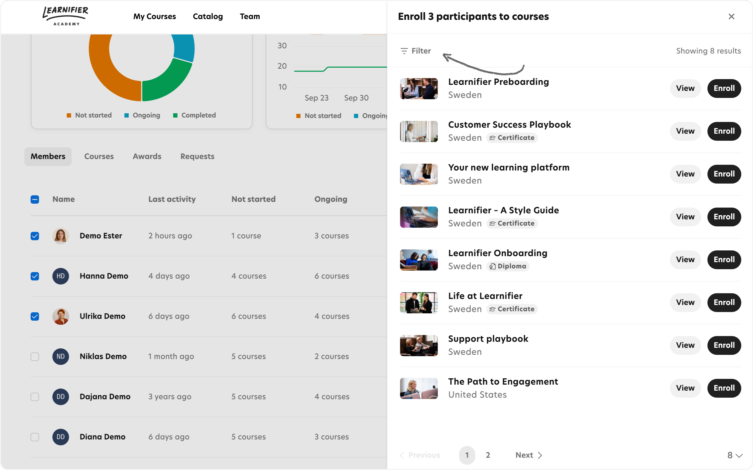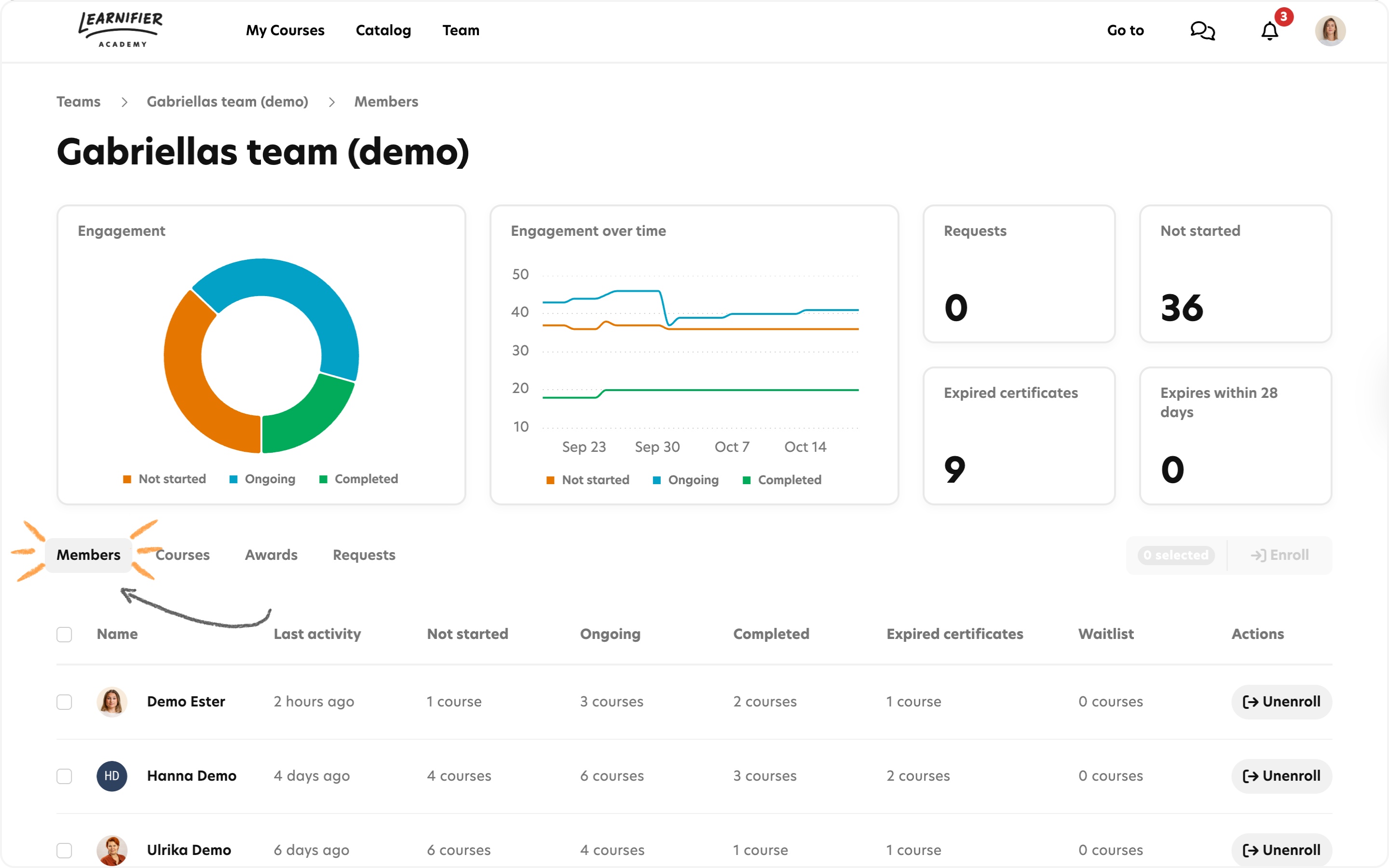 - Enroll or unenroll team members in courses (pick a course and use multi-select to manage several members at once).