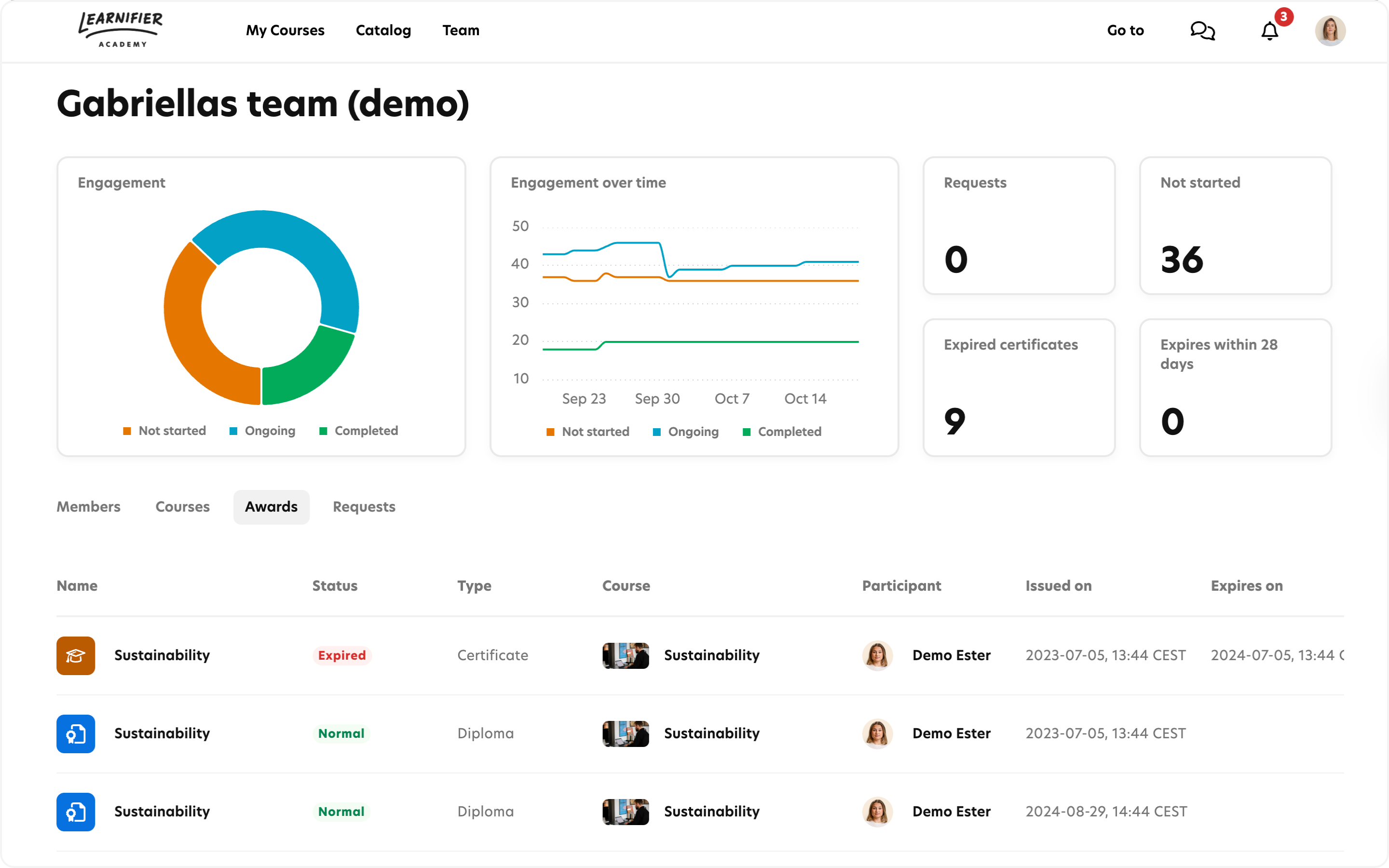 With Team View, managers can easily support their team’s learning journey. They can enroll or unenroll members from courses, track progress, manage requests, and gain insights into learning trends, all in one place.
